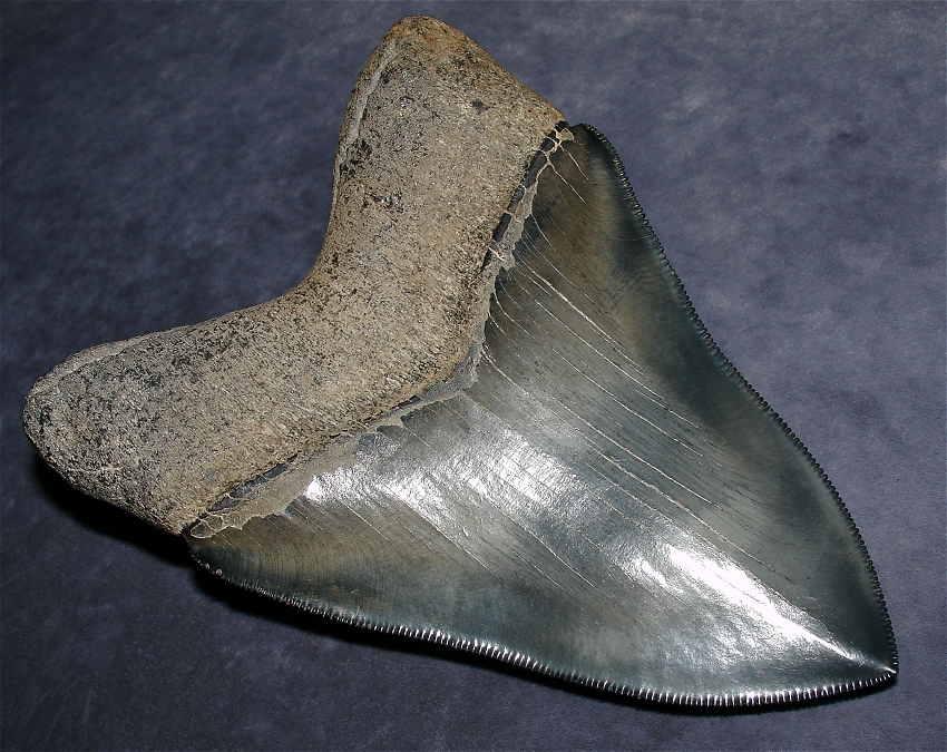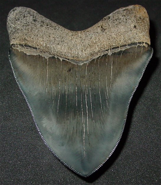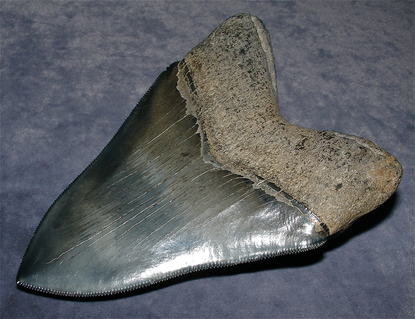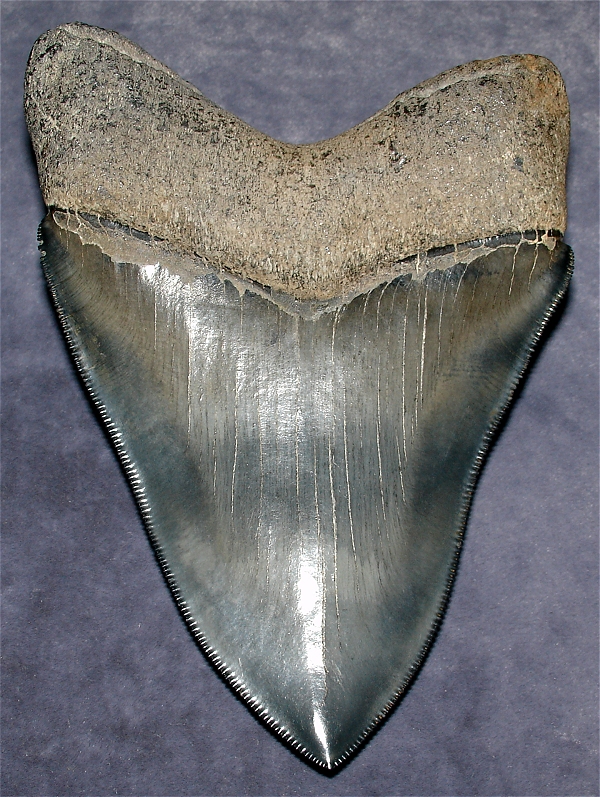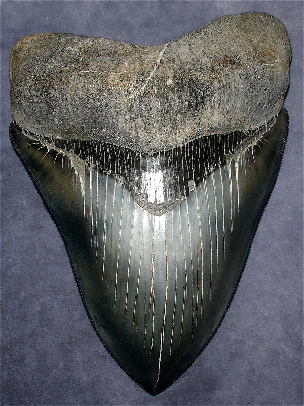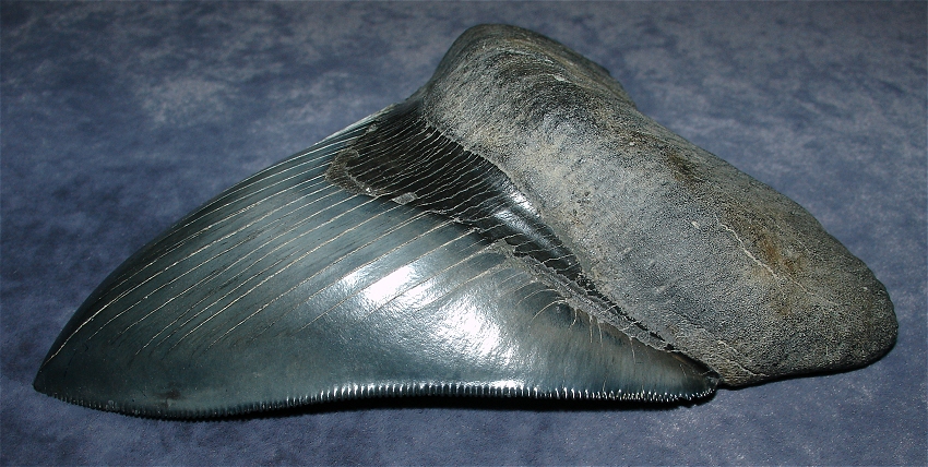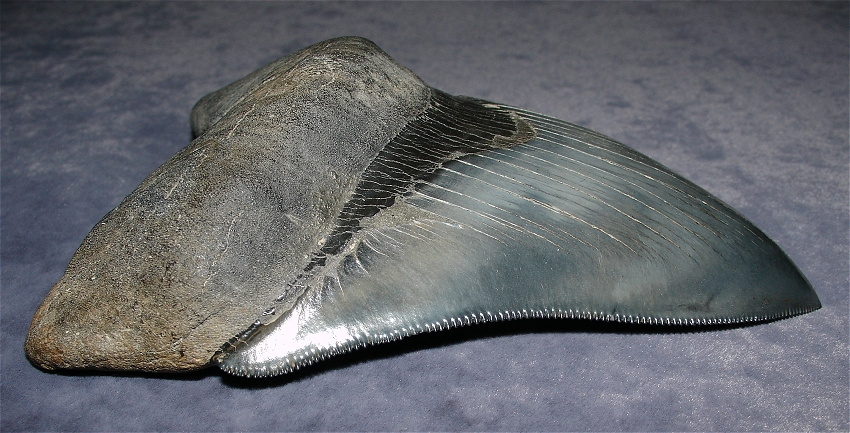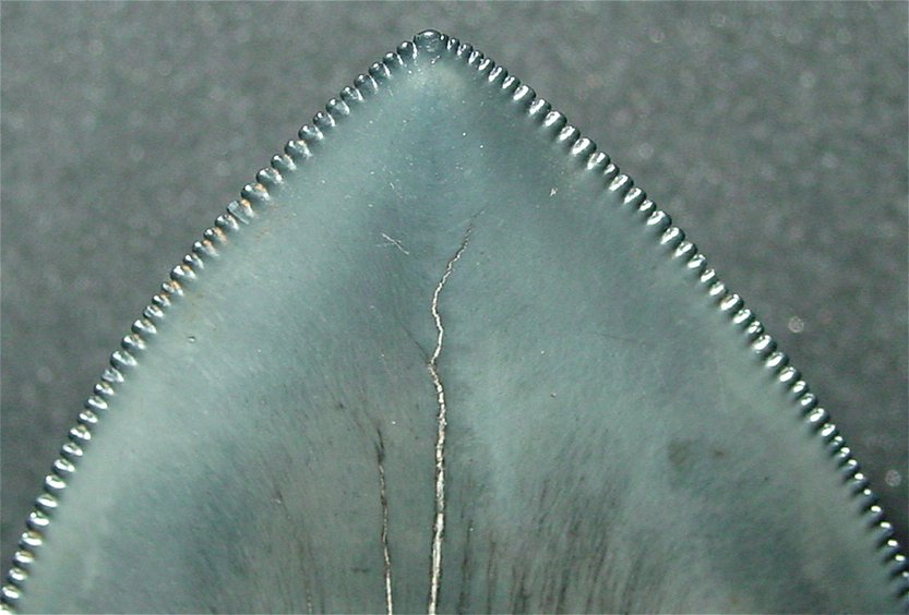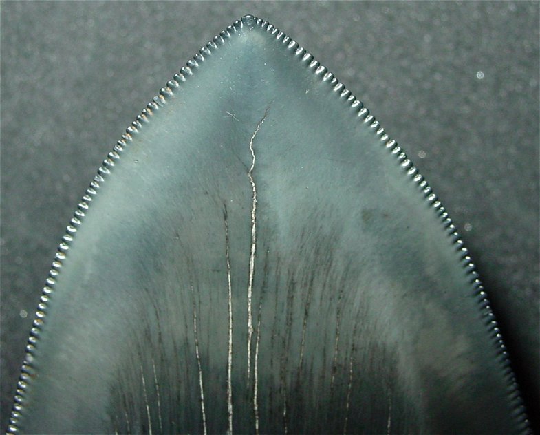| Ein SUPER SCHARFER Traum !!! Das ist der schärfste Zahn den ich je gesehen habe und einer der SCHÖNSTEN dazu !!! Schwer einen Anfang zu finden. Die Wurzel ist beeindruckend massiv, die bläuliche Färbung und der Glanz der Emaille sind ein "Gedicht". Die tiefschwarze Bourlette bildet einen wunderbaren Kontrast zur Emaille. Die Form ist ein Traum. Die eingelagerten Pyritkristalle sind eine weitere, seltene Besonderheit. Der absolute Hammer ist aber die Schärfe des Zahnes. Normalerweise werden die Zacken der Schneiden immer kleiner, je größer ein Zahn wird. Nicht bei diesem Zahn !!! Die Zacken der Schneiden sind so außergewöhnlich groß und einfach ein Traum !!! Ich habe noch keinen vergleichbaren Zahn gesehen !!! Ein FANTASTISCHER Zahn !!! O | |||||||||