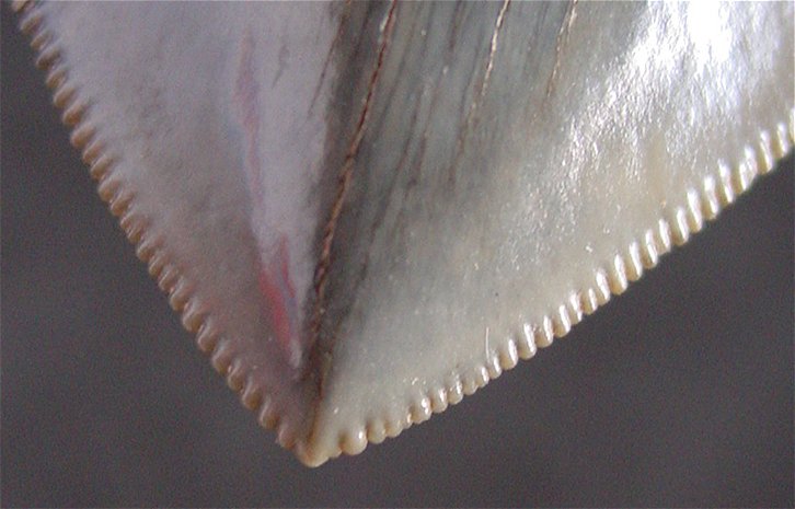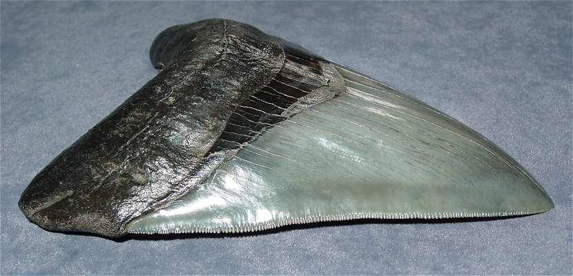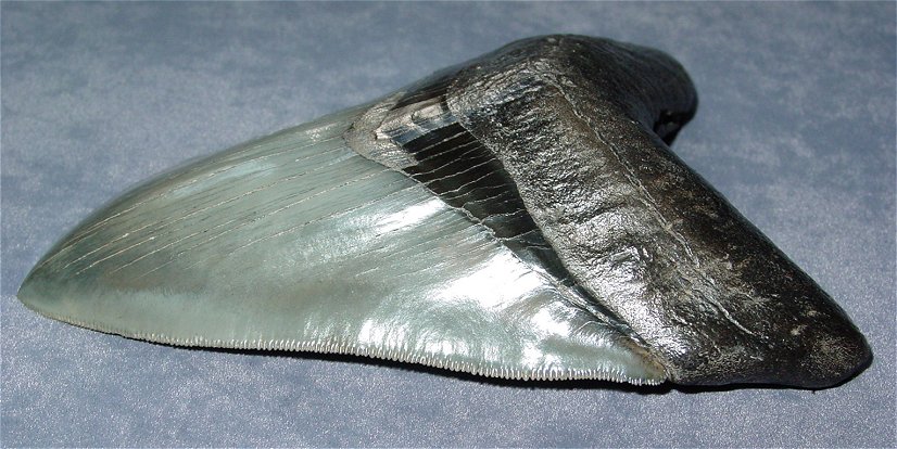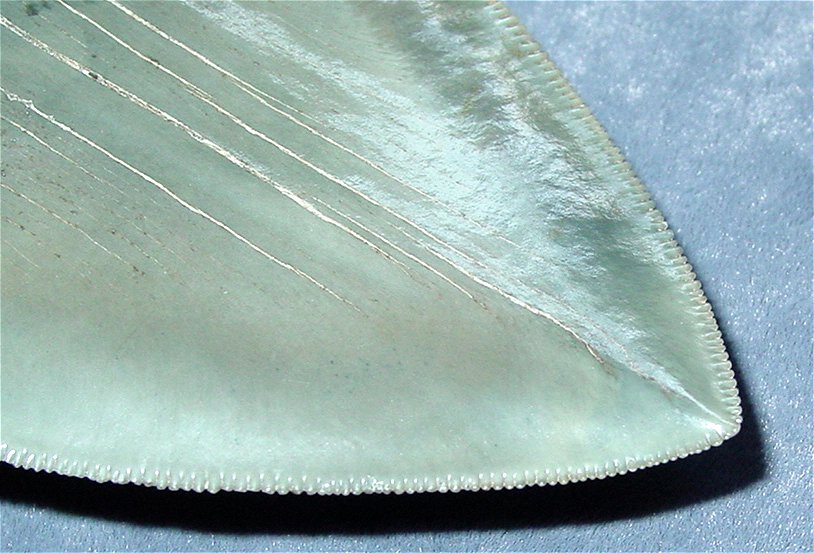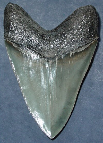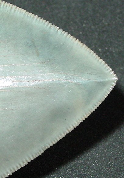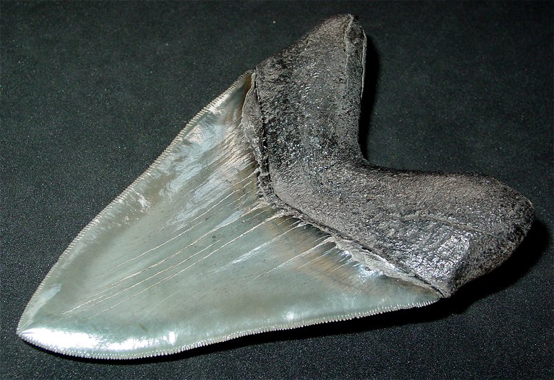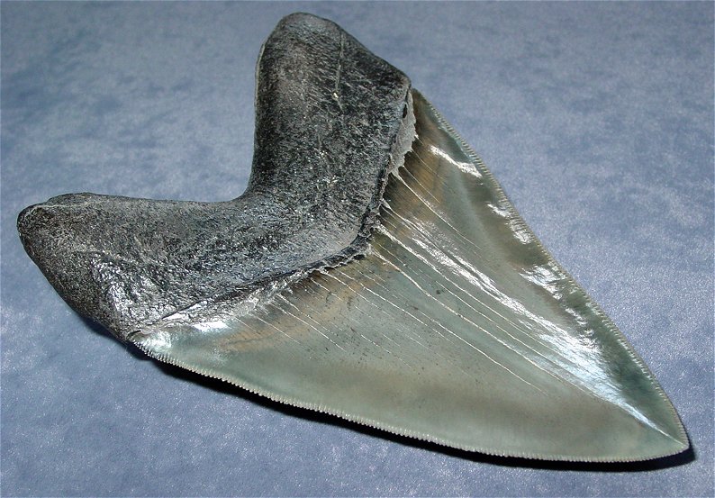 Dieser FANTASTISCHE Zahn gehört mit zu den schönsten die ich je gesehen habe !!! SUPER, SUPER glänzende, wunderbar blau-graue Emaille. Fantastische tiefschwarze Bourlette. Die Schneiden sind ABSOLUT PERFEKT, ich kann nicht eine fehlende Zacke entdecken. Fantastische Symmetrie, PERFEKTE Spitze !!! Und als absolutes HIGHLIGHT ist die GESAMTE Wurzel, sowie Teile der Bourlette mit PYRITKRISTALLEN übersäht !!! W AAAAHNSINN !!! * |
