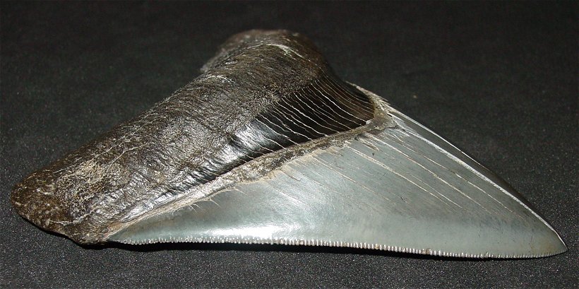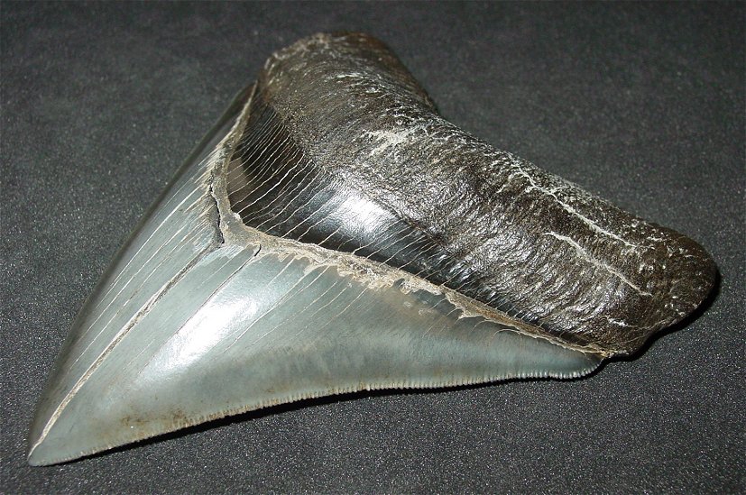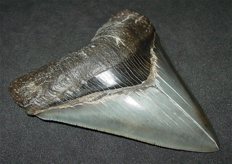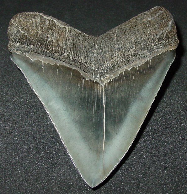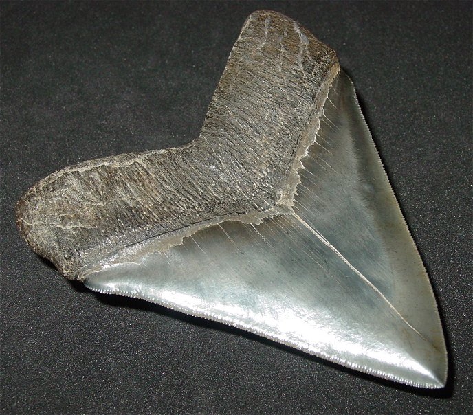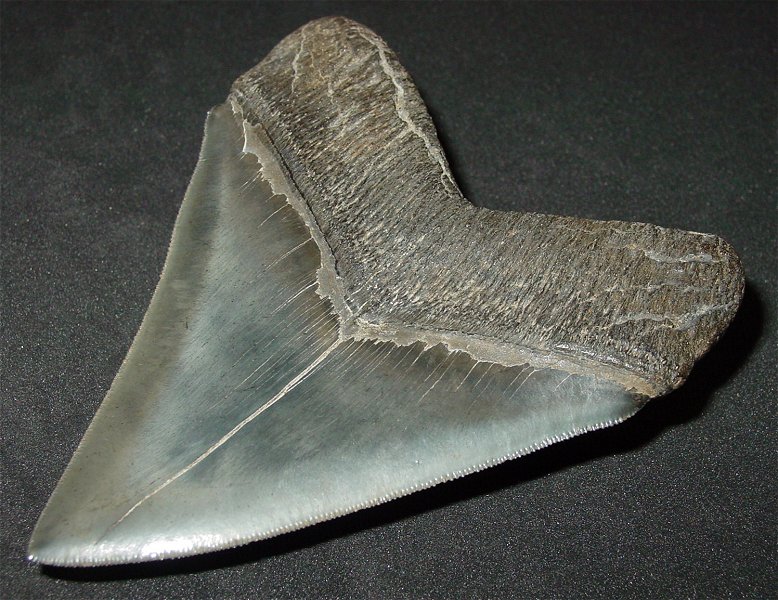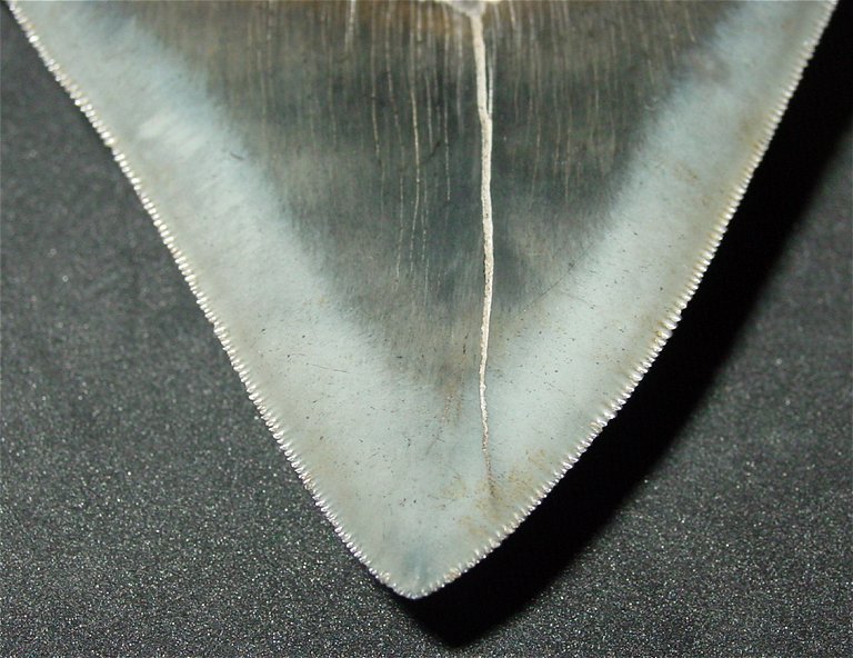 Das ist einer der schärfsten Zähne die ich je gesehen habe !!! Die wunderbar schwarze Bourrelet ist zu 100% erhalten - eine absolute SELTENHEIT !!! Sie bildet einen herrlichen Kontrast zu der wunderschönen grauen Emaille des Zahnes. Die Wurzel ist traumhaft schön und zeigt sogar noch ein kleines Loch, wo ehemals die Versorgungsgefäße hineinführten. Neben der Sehr schönen Symmetrie des Zahnes sind die SUPER SCHARFEN Schneiden einfach beeindruckend !!! Als Krönung sind zwischen Bourrelet und Emaille sogar noch einige Pyritkristalle eingelagert. Ein SUPER Zahn !!! O |