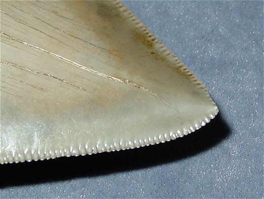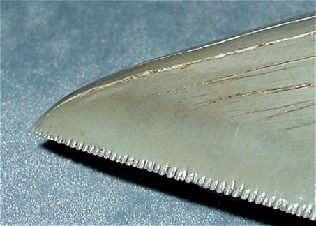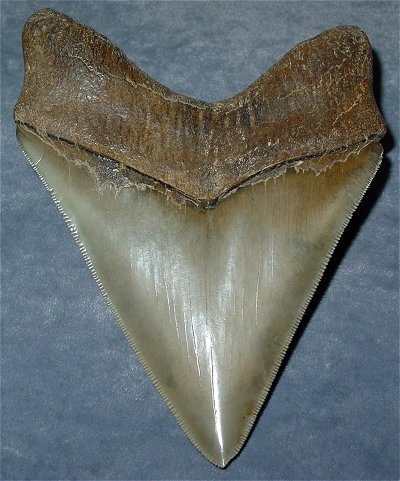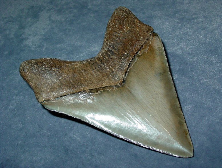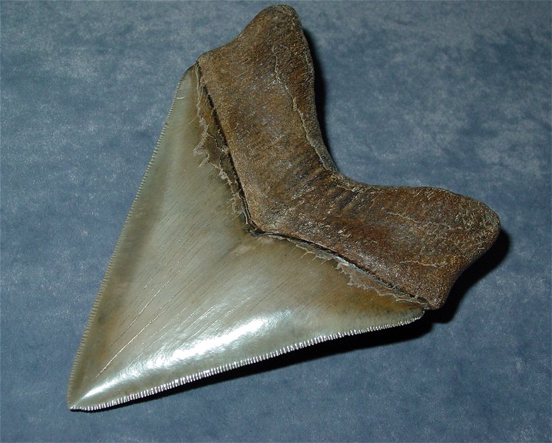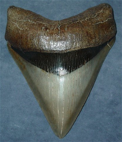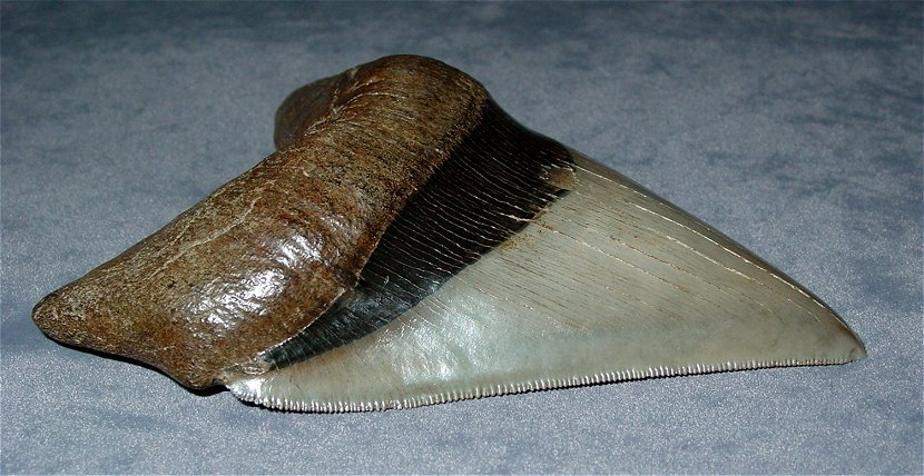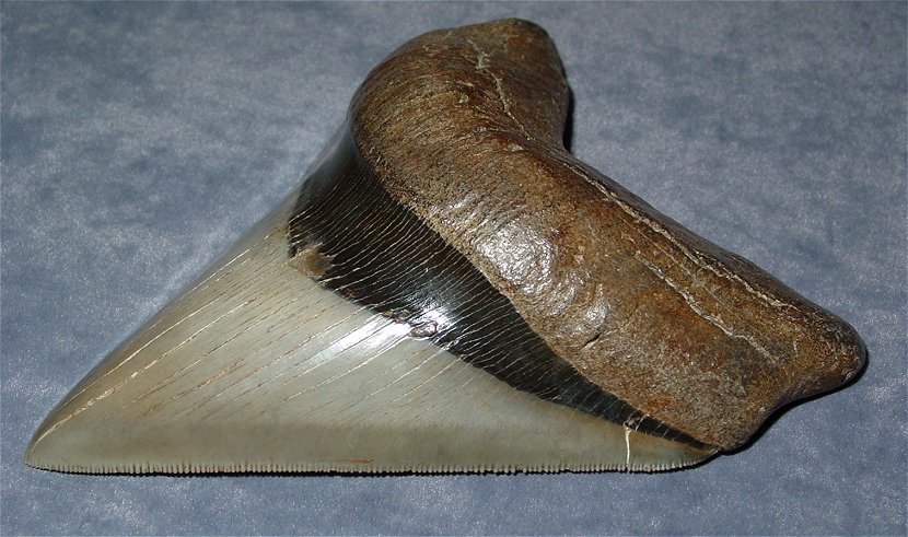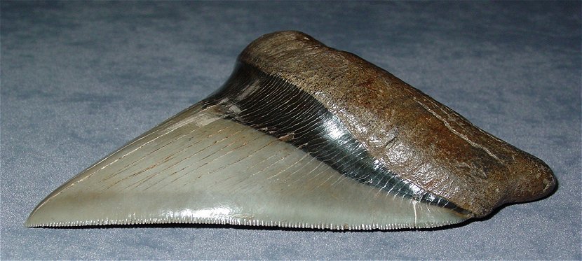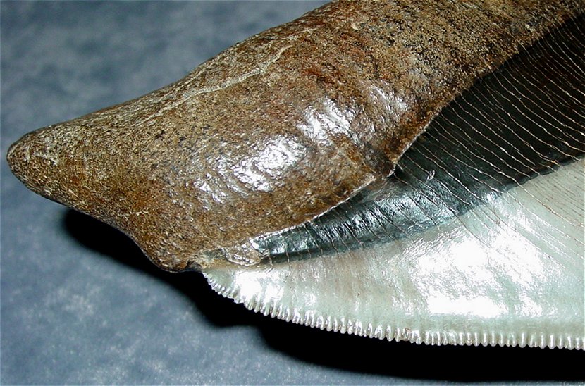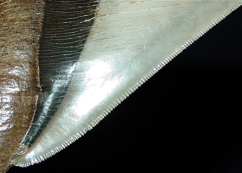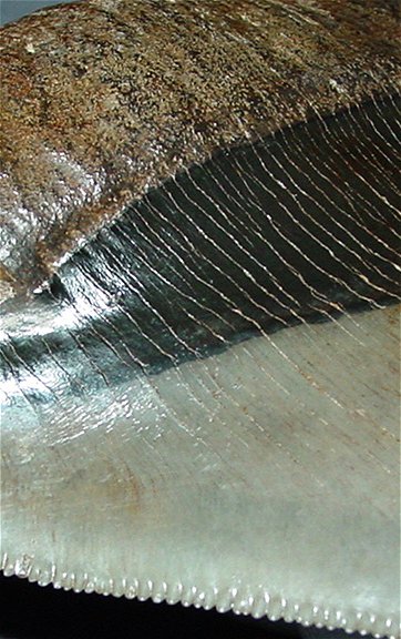 Neben seinen rasiermesser scharfen und perfekten Schneiden besticht dieser Zahn vor allem durch seine einzigartigen und traumhaften Farbkontraste. Auch die Form ist absolut beeindruckend. Das aber absolut einzigartige bei diesem Zahn ist die TIEFSCHWARZE und UNBESCHREIBLICH SCHÖNE Bourlette ( Dentalband ) !!! Ich habe wirklich NOCH NIE eine SO SCHÖNE Bourlette bei einem MEG gesehen, und bei einem Zahn dieser Größe kann man das gar nicht glauben. Der Zahnschmelz geht völlig übergangslos in das Dentalband über und dieses dann wieder völlig übergangslos in die traumhaft schöne Wurzel, in der einige wunderschöne "Nutrition Holes" zu sehen sind. ALLE Megs die ich JE gesehen habe, haben vom Übrgang der Emaille zu der dünnen Emaille der Bourlette eine deutliche Kante oder Rille. Wahrscheinlich wird die dünne Emaille des Dentalbandes schneller abgetragen, als die Harte Emaille der Krone. Auch wenn die Bourlette 100% vollständig ist, sieht man hier IMMER eine feine Bruchrille. Möglicherweise ist hier auch eine "Sollbruchstelle, die bei der Hydration (Wasseraufnahme) während der Fossilation entsteht. NICHT bei diesem Zahn. Der Übergang ist wie aus einem GUSS, als wäre der Zahn gerade ausgefallen und nicht einige Millionen Jahre alt !!! WAAAAHNSINN !!! * |