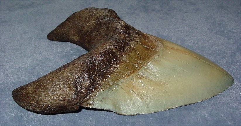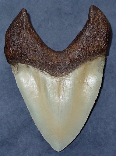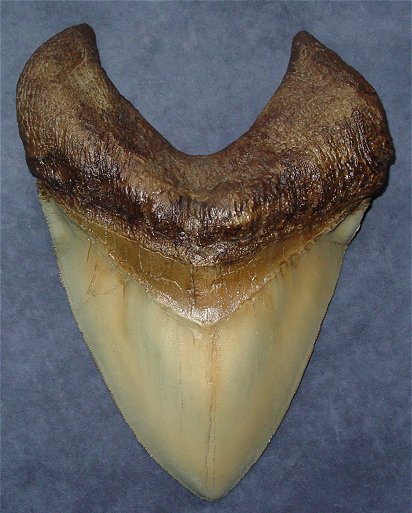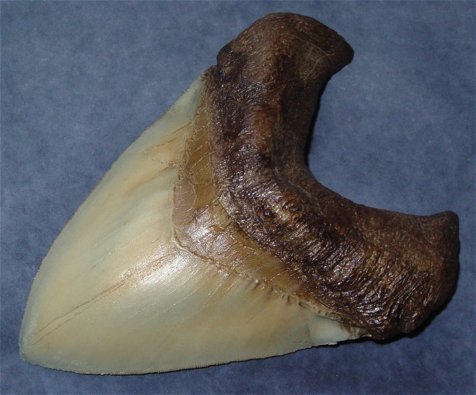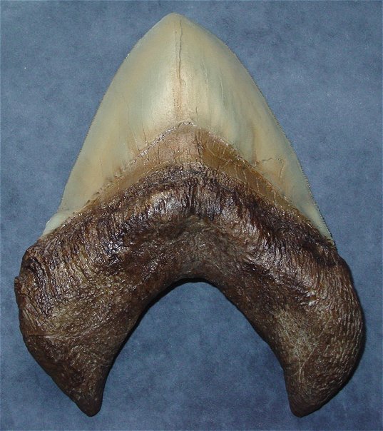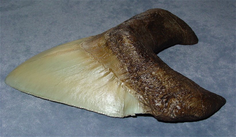 Ja, das ist er !!! Der WELTGRÖSSTE MEG !!! Ihr seht hier eine REPLIKA des größten VOLLSTÄNDIGEN MEGALODON Zahnes der bisher weltweit gefunden wurde. Und die Betonung liegt eindeutig auf VOLLSTÄNDIG !!! Dieser Zahn misst sage und schreibe 7,25" inch = 18,41 cm !!! Als Vergleich: Der grösste bekannte Zahn eines modernen Weissen Hais misst gerade mal 2,625" inch = 6,67 cm. Dieser rezente Zahn eines "Grossen Weissen" wurde für US$ 5000,- verkauft. Das trägt sicher nicht zum Schutz dieser majestätischen Tiere bei. Ich halte das für wenig ruhmreich und betone nocheinmal, dass wir aus Überzeugung KEINE rezenten Haizähne anbieten. Zurück zu Megalodon: Ich habe mir diese REPLIKA in meine Sammlung gestellt, um immer zu sehen wieviel mir noch zum Weltrekord fehlt - es sind ganze 2 cm. Nein aber mal im ernst, hat dieser Zahn nicht eine teuflisch schöne Form ??? Interessanterweise ist die Krone nicht viel größer als bei anderen Giganten, den Größen-Weltrekord erlangt dieser Zahn durch die "Hörneraritg" ausgezogene Form der Wurzel. Nicht nur die Größe, auch die sagenhafte Form des Zahnes ist einmalig auf der Welt. Aktuallisierung 02- 2006: Ich hatte die Große Freude einen zwar gebrochenen aber NOCH GEWALTIGEREN MEG in den Händen zu halten. Ich habe den Zahn selbst mit einem digitalen Meßschieber vermessen. Der Zahn hat eine maximale Kantenlänge von ECHTEN 7,43" inch = 18,88 cm. Das zieht einem die Schuhe aus !!! o |